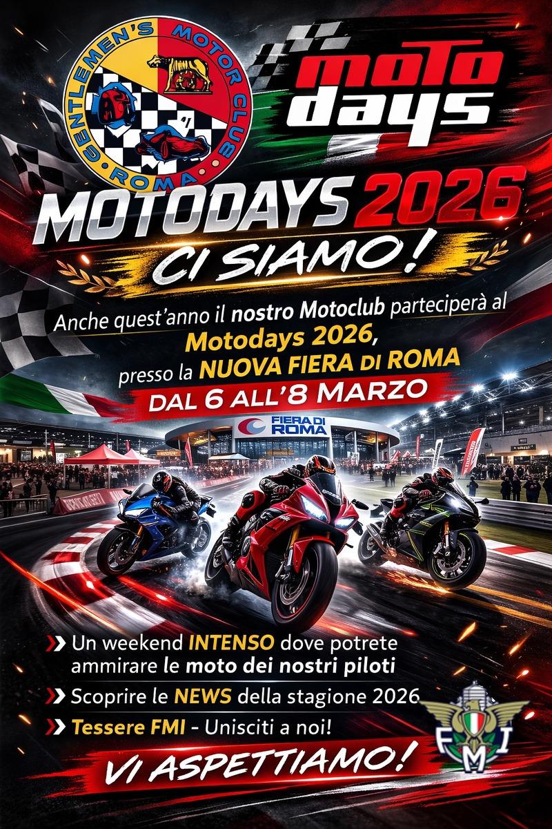 Il conto alla rovescia è iniziato: dal 6 all’8 marzo 2026, presso la Nuova Fiera di Roma, torna uno degli appuntamenti più attesi dagli appassionati delle due ruote, Motodays, e anche quest’anno il Gentlemen’s Motor Club Roma sarà presente con il proprio stand e un ricco programma di attività.
